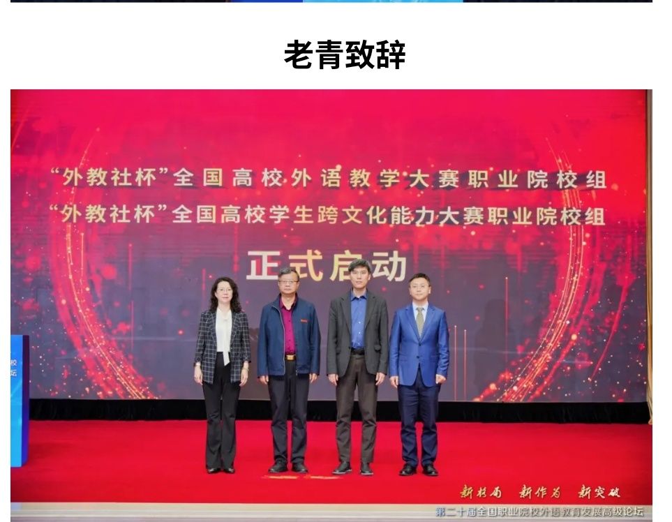 开幕式上,上海外国语大学校长孟钟捷教授、湖南工业职业技术学院王璞书记、“外指委”副主任委员老青教授纷纷致辞。专家们围绕职业外语教育主动服务国家战略、助力企业高质量出海、构建“外语+产业”融合培养体系、优化数智教学创新生态等方面建言献策、凝聚共识,充分激发职业外语教育的内生动力。赛事宣布环节,“外教社杯”全国高校学生跨文化能力大赛职业院校组和“外教社杯”全国高校外语教学大赛职业院校组比赛隆重启动。